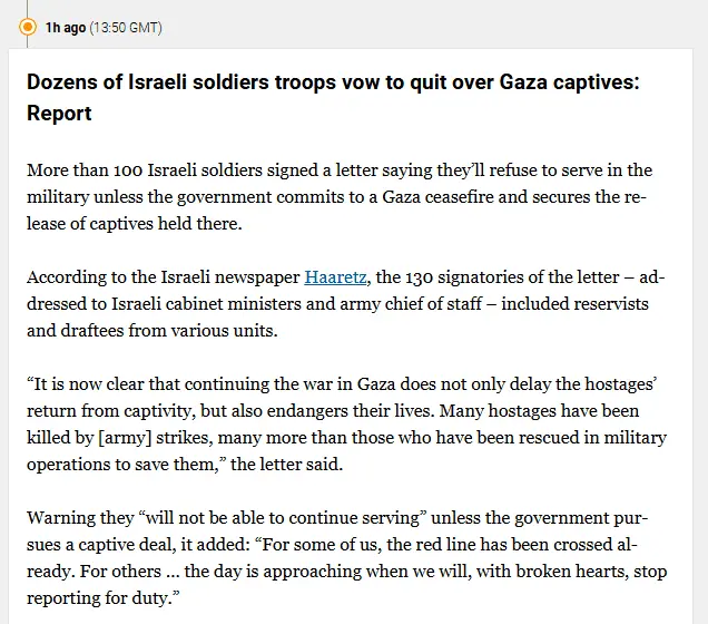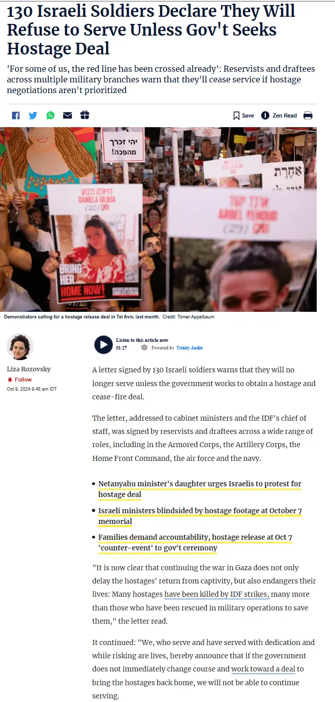 Netanyahu the mad dog doesn't want a deal because he has no excuse then for his Genocide, not that he had one anyway.Some interesting developments to report, most relevant to me is this being reported by Haaretz, it's called mutiny: