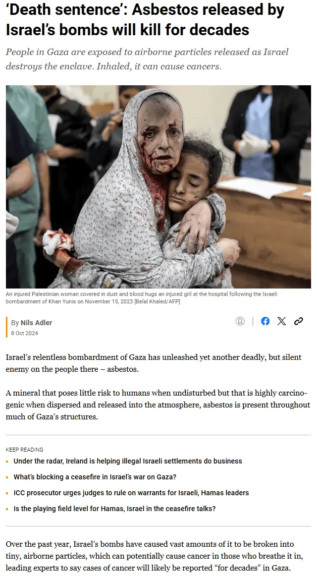 why, given all the millions of aid to build infrastructure, would they build anything using asbestos? Is there asbestos in the tunnels? Probably not.More devastating news for the Gazan's as yet another tool in the genocide toolbox gets used.