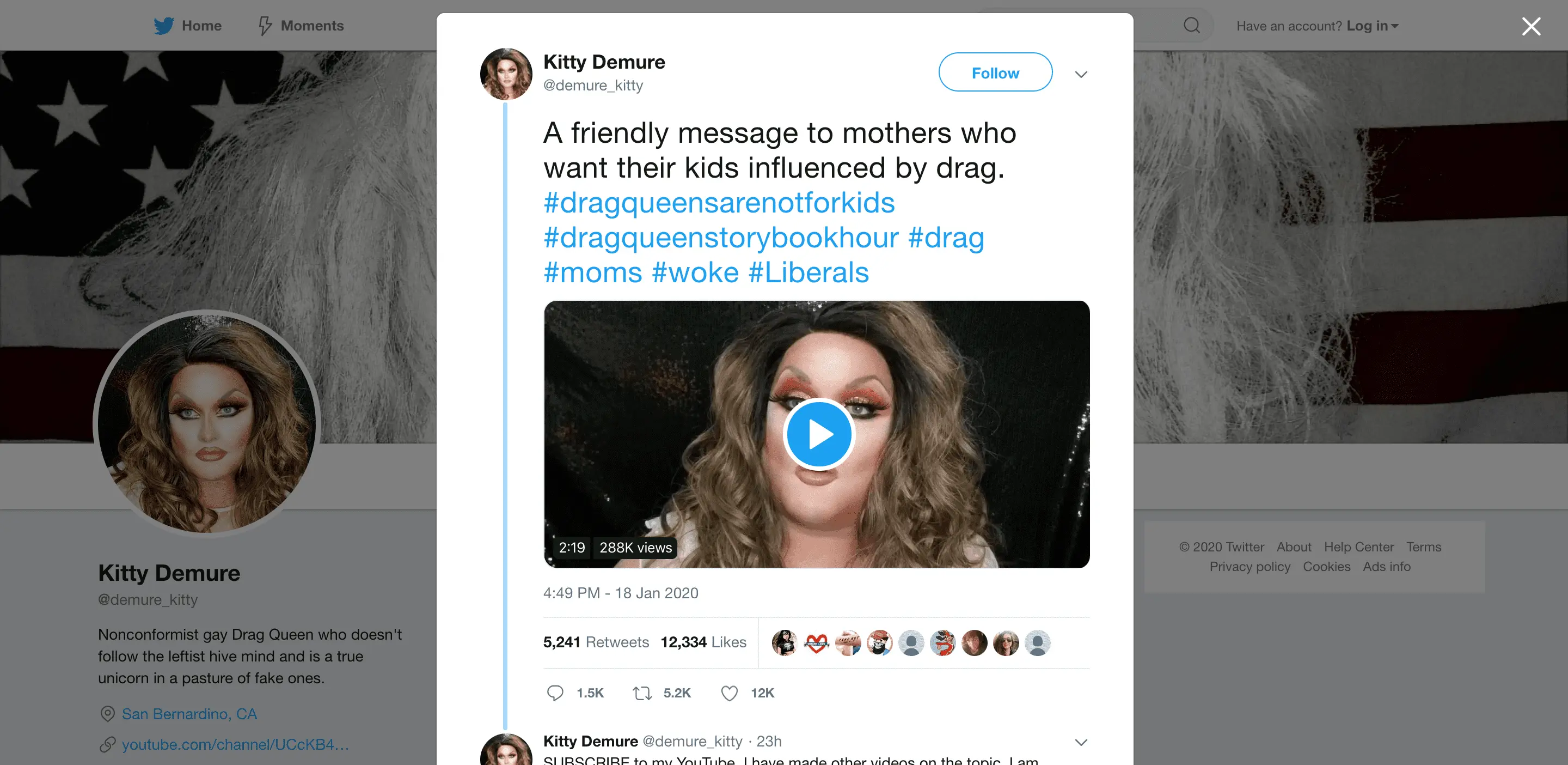 Drag queen Kitty Demure posted a viral video in which he expressed his amazement at why ‘woke’ parents are allowing their kids to be around drag queens, asking, “Would you want a stripper or a porn star to influence your child?”