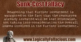 The sunk cost fallacy is when because you have invested time, money and effort into something, you should keep doing so even though it isn't working.