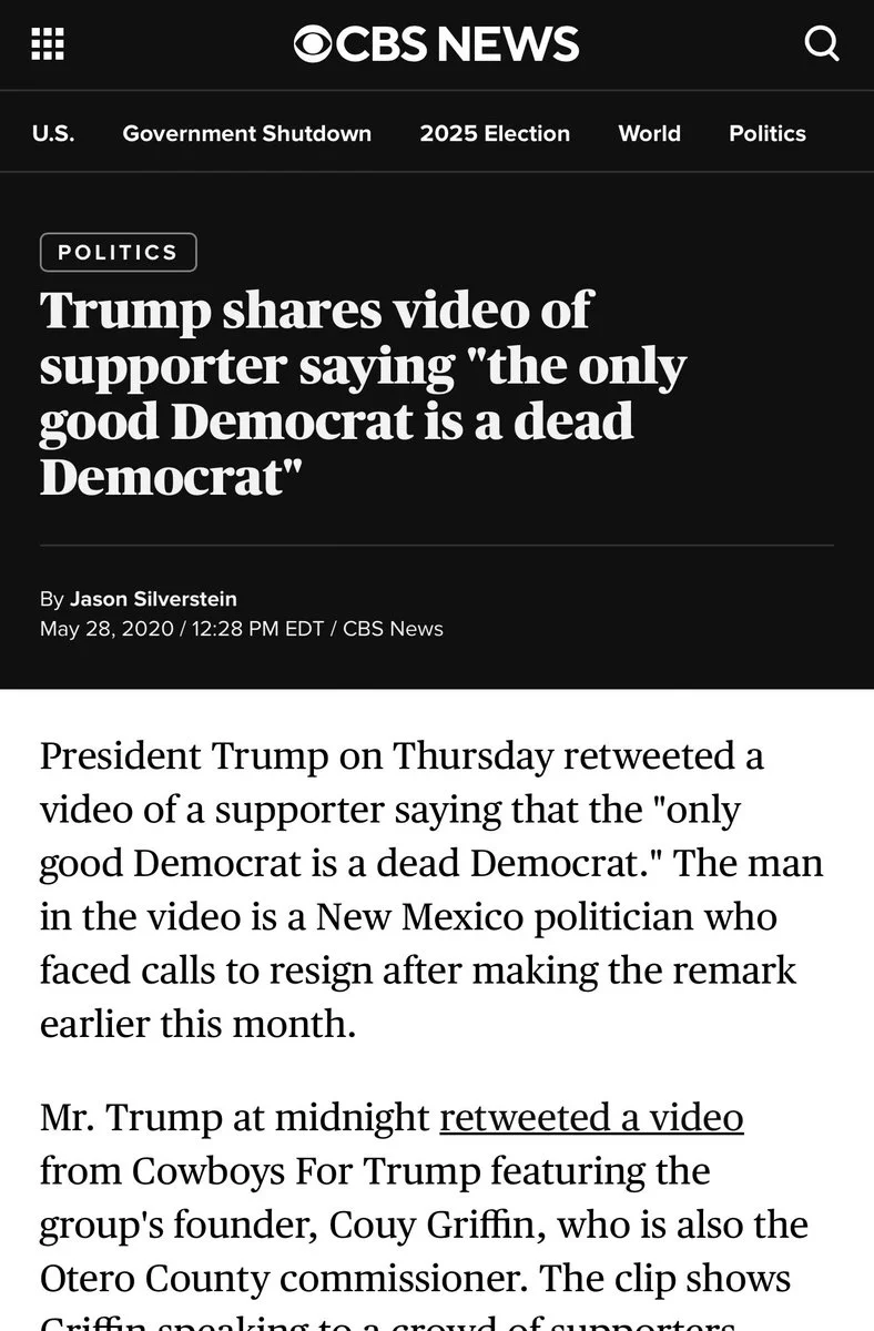 Moments later, Griffin again says that "the only good Democrat is a dead Democrat," but adds that he's "saying it politically-speaking" and that he's calling for conservative candidates to take the majorities in New Mexico's government.