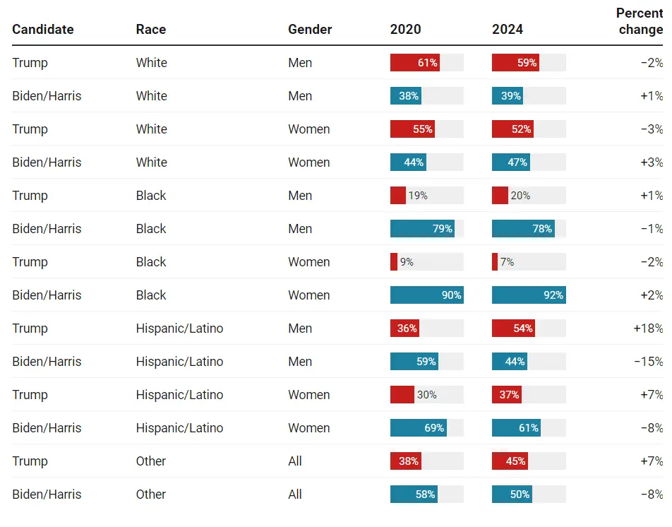 When you look at the demographics it shows that the majority of non white voters voted for Harris and the majority of whites voted for Trump. Hispanic men are the only non white group that went for trump.Uh ... okay.