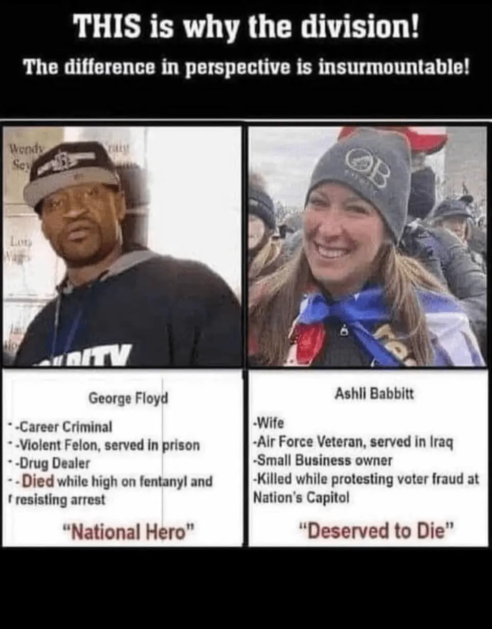 She was shot legally breaking and attempting to enter the Capitol Building as part of a mob committing an insurrection. He was murdered by a police Sgt. with his knee on his neck for 10 minutes or so. He was crying to breath with witnesses watching all of the time.She was murdered and you know it. Apply the same laws to Her as you were so gladly willing to apply to Floyd.