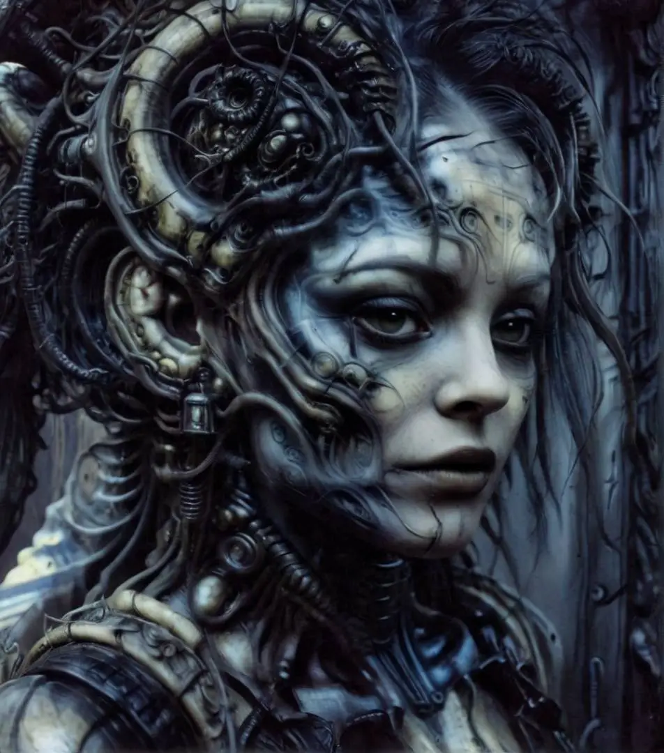 others in that series came out cool, the base used to diffuse(renoise) was my old graphics using real models and photoshop brush texture art.That's very much in the style of H.R. Giger, the designer for the movie Alien.