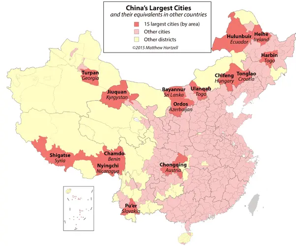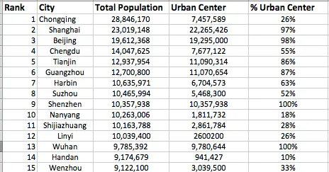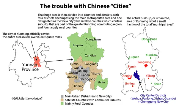 Total population of say, Handan, 9 million of Chinamen, but only 10% of them live in the urban center. All other live in other "cities", "towns" and even "villages".