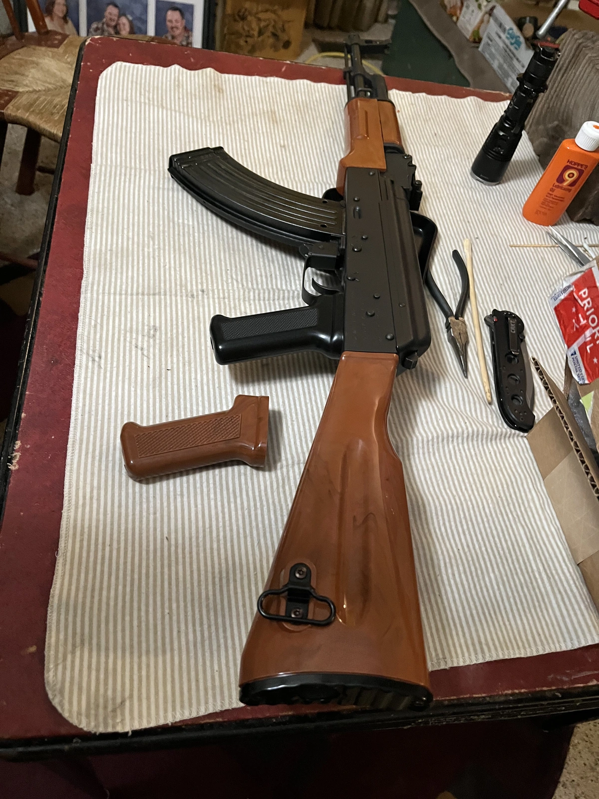 Swapped out Original Romanian Wood & Installed Faux Phenolic but unsure if I should go all the way with the Faux Phenolic Grip ( or leave Black Plastic Grip because it matches Trap door Butt Plate and sling swivel ??? ) what do you folks think