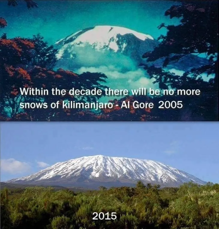 'Gore claims the snowcap atop Africa's Mt. Kilimanjaro is shrinking and that global warming is to blame. Yet according to the November 2003 issue of Nature magazine, "Although it's tempting to blame the ice loss on global warming, researchers think deforestation of the mountain's foothills is the more likely culprit. Without the forests' humidity, previously moisture-laden winds blew dry. No longer replenished with water, the ice is evaporating in the strong equatorial sunshine."' (James Taylor)