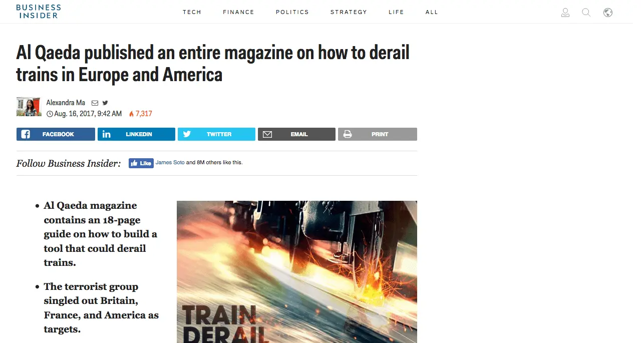 Al Qaeda published an entire magazine on how to derail trains in Europe and America