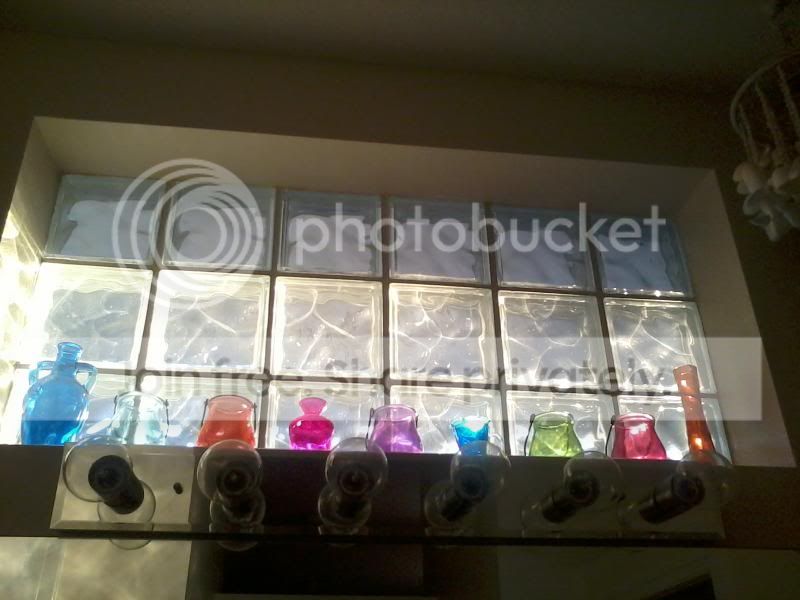 I have a similar set up in my bathroom, except my window is glass blocks. I love how the morning sun comes through and bathes the room in all the pretty colors from the vases.