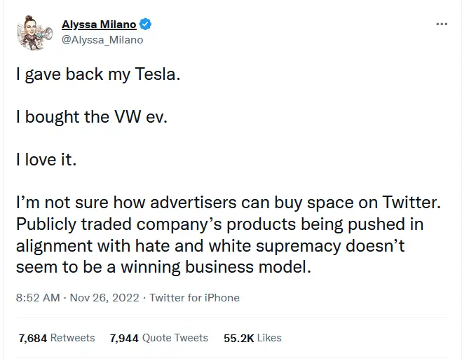 “I gave back my Tesla. I bought the VW ev. I love it. I’m not sure how advertisers can buy space on Twitter. Publicly traded company’s products being pushed in alignment with hate and white supremacy doesn’t seem to be a winning business model.”