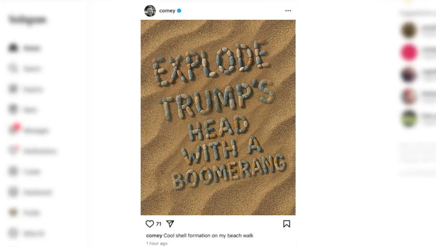 The photo, posted on Comey's Instagram account, depicted a collection of rocks which he claimed to have found sitting in a natural formation. According to Comey, it was entirely a coincidence that they happened to spell out "EXPLODE TRUMP'S HEAD WITH A BOMBERANG."