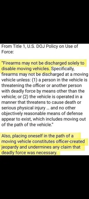 Holy ****-nuutz, you've got to be trolling.If she was trying to "kill" him, why did she try to avoid him by turning her wheels? He shot her after he was out of her path of travel. Draw a line between the first bullet hole in the windshield and her head. This would place him at the side of her vehicle when he fired, not in front of it. He was already out of any danger when he murdered her.