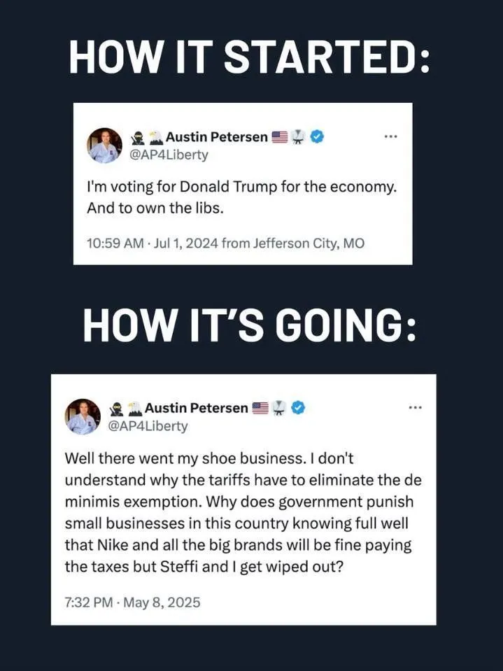 This guy, Austin Peterson, voted for Trump to say he owns the libs. He voted for Trump because he wanted to see others suffer. Now he's suffering. He lost his business because of the tariffs. And Coach D's sentiment is echoed by a whole lot of people.