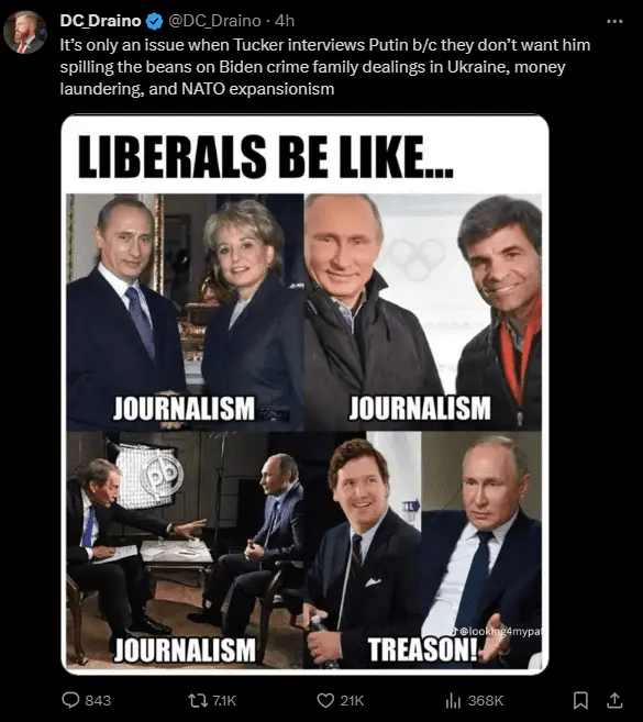 Tucker is a putin´s agent...I personally informed you, on at least a half dozen occasions who started that war (Obama/Biden 2013/14) and you shut up your little ears and began chanting, " na na na nahhhh, I can't hear you!" You have no idea what you are talking about, I'd take Vlad Putin over Obama/Biden every time, indeed I will aid Russia directly against the fascists in DC if it comes down to it, Biden and its open, brazen treason and corruption leaved Putin prepped for canonization.....![]()