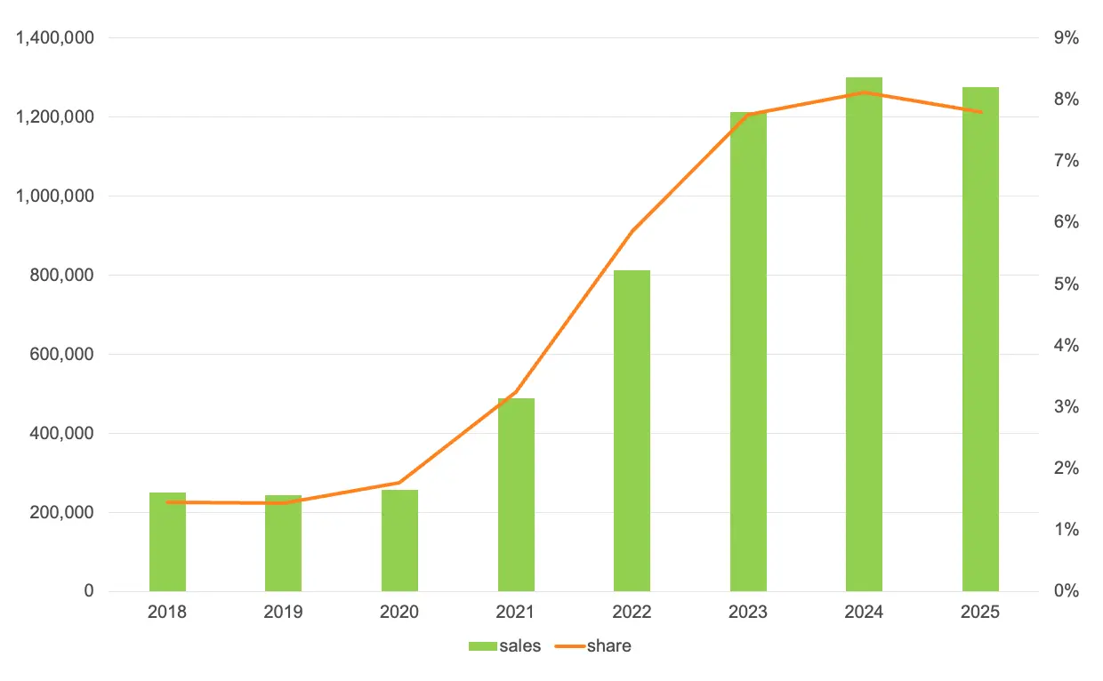 While the Q4 collapse will command headlines, total EV sales in calendar year 2025 tell a different story: Thanks in part to record volume in Q3, total EV sales last year came in just shy of 2024’s 1.30 million. In fact, 2025 was the second-best year on record for EV sales in the U.S., and the EV share of total market sales was a strong 7.8%, down from 8.1% a year earlier, according to Kelley Blue Book estimates.