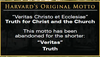 Harvard's Rules and Precepts of 1636 tells us that all knowledge rests on the foundation of God and Jesus Christ. Harvard's original motto was Truth for Christ and the Church.