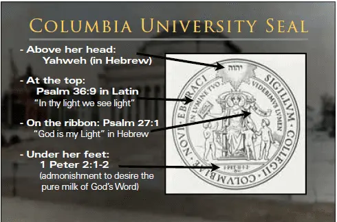 Coumbia university's seal of 1755 has the hebrew Tetragrammaton, YHVW (Jehovah) within a radiant triangle. The school's motto "In Lumine Tuo Videbimus Lumen" means "In thy light we shall see light" Psalms 36:9, arcs across the top.