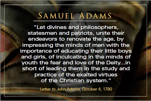 In 1790 Samuel Adams said, ""Let divines and philosophers, statesmen and patriots, unite their endeavors to renovate the age, by impressing the minds of men with the importance of educating their little boys and girls, of inculcating in the minds of youth the fear and love of the Deity...in short of leading them in the study and practice of the exalted virtues of the Christian system.“
