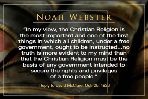 In 1836 Noah Webster said, “In my view, the Christian Religion is the most important and one of the first things in which all children, under a free government, ought to be instructed...no truth is more evident to my mind than that the Christian Religion must be the basis of any government intended to secure the rights and privileges of a free people.”