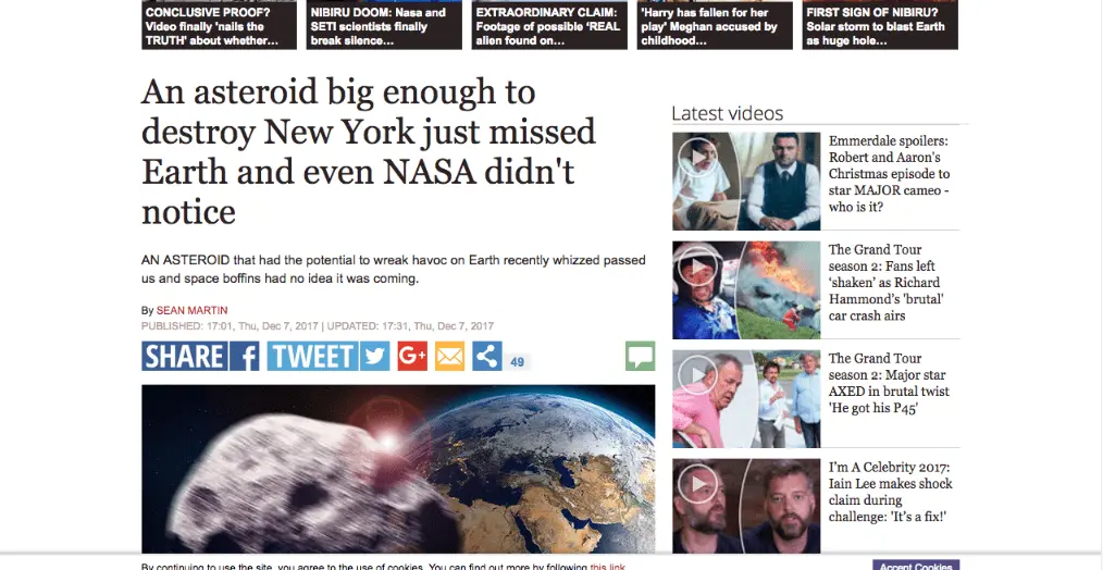 An asteroid that had the potential to wreak havoc on Earth recently whizzed passed us and space boffins had no idea it was coming. The asteroid, known as 2017 VL2, shot by Earth on November 9 and experts did not find out about it until a day later. The space rock flew by just 73,000 miles from our planet – which is a third of the distance between Earth and the moon. Experts believe the asteroid is between 16 and 32 meters long, and if it hit Earth, it would have had the potential to flatten a city such as New York.