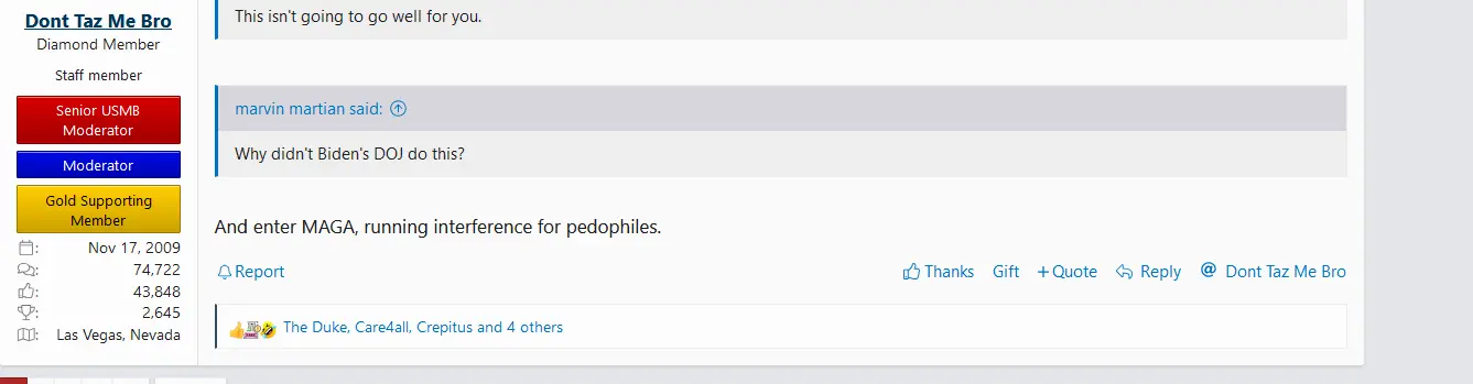Show us the rule I broke. Go aheadYou'll get banned. Certain things are not acceptable here. I'll page the mods right now about your slanderous signature. That's beyond the pale.