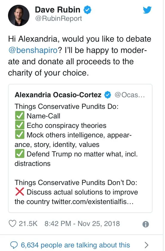 I think her tweet sums it up. Hyperbole void of actual issues.She can't debate, she's way too stupid. Might as well challenge "low IQ" Maxine while you're at it.