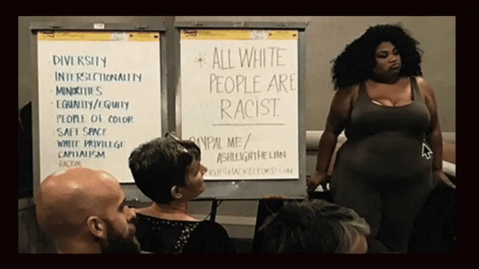 "... as the board proclaims, all white people are racists. Below that proclamation the class finds: Pay Pal me/ Ashleighthelion, and below that AshleighShackelford.com, a reference to the instructor telling the People of No Color they are all racists.