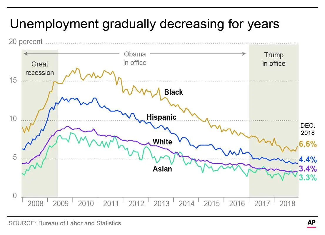 The most dramatic drop in black unemployment came under President Barack Obama, when it fell from a recession high of 16.8 percent in March 2010 to 7.8 percent in January 2017.