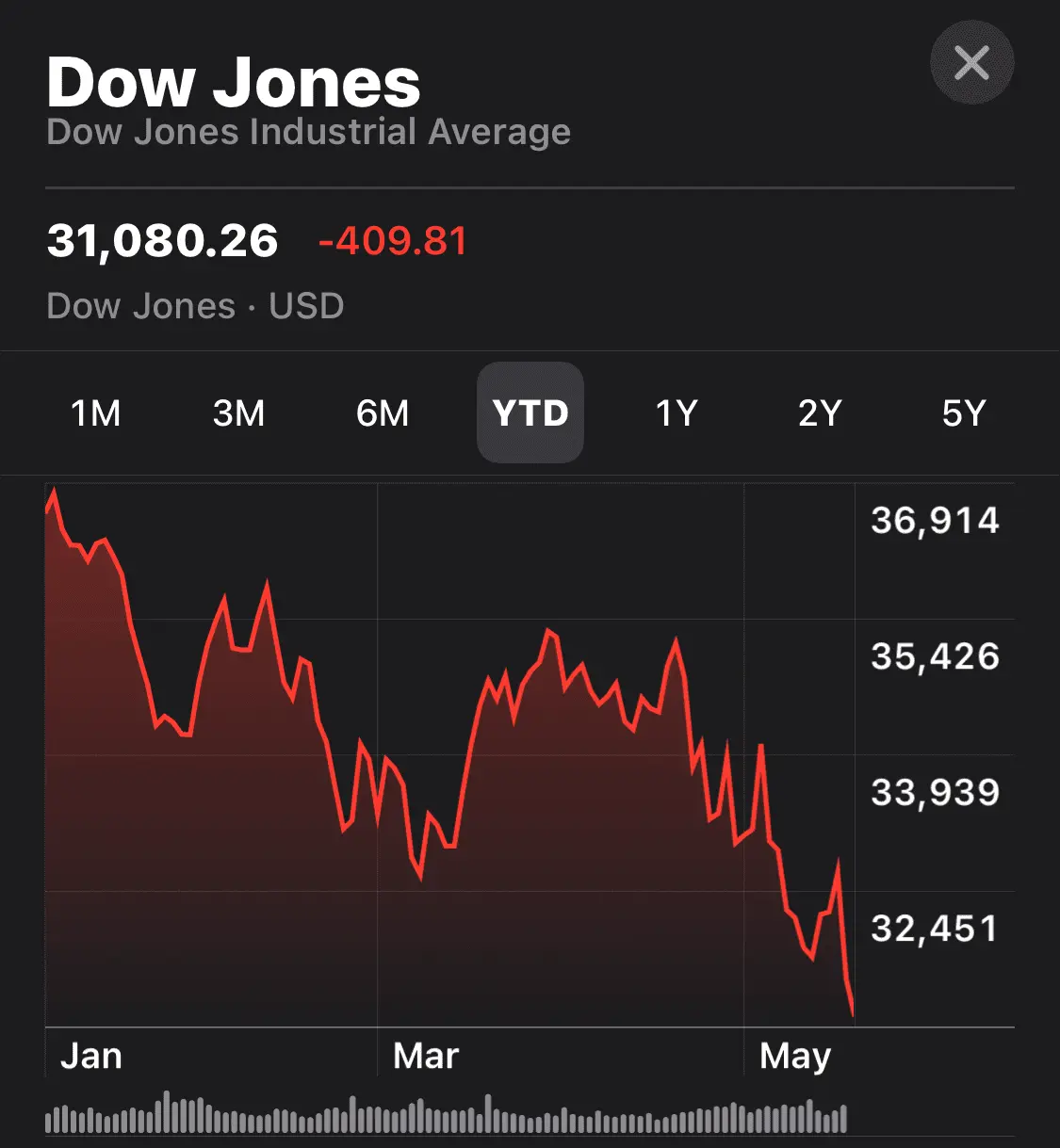 The Dow Jones Industrial Average was down 236.94 points, or 0.75%, while the Nasdaq Composite fell 0.26%. The S&P 500, which ended the session 0.58% lower, approached bear market territory.