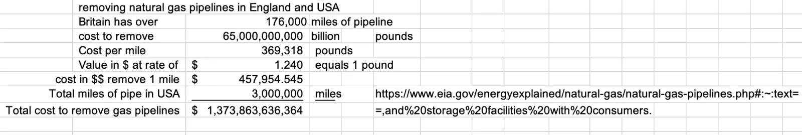 According to British study it will cost $1,373,863,636,364 to decommission and or remove the 3 million miles of gas pipelines in the USA.