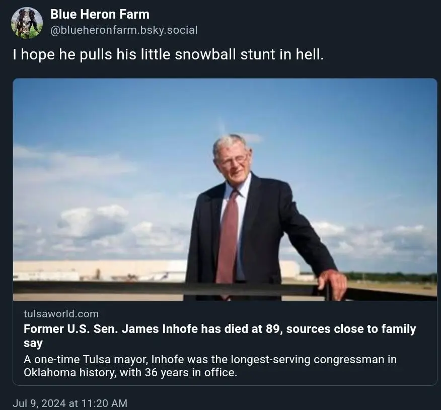 James Inhofe is dead at 89. Horrible Senator, bought and paid for by the oil lobby.