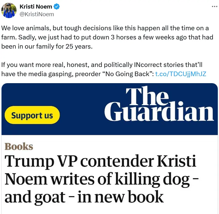 Trump VP contender Kristi Noem writes of killing dog – and goat – in new book