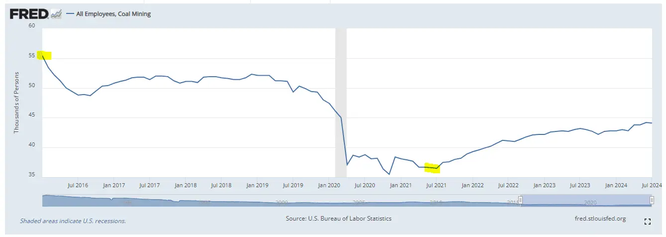 Under Trump total coal miner jobs in the US went from 55,000 when Trump came into the office to 37,000 when he left.