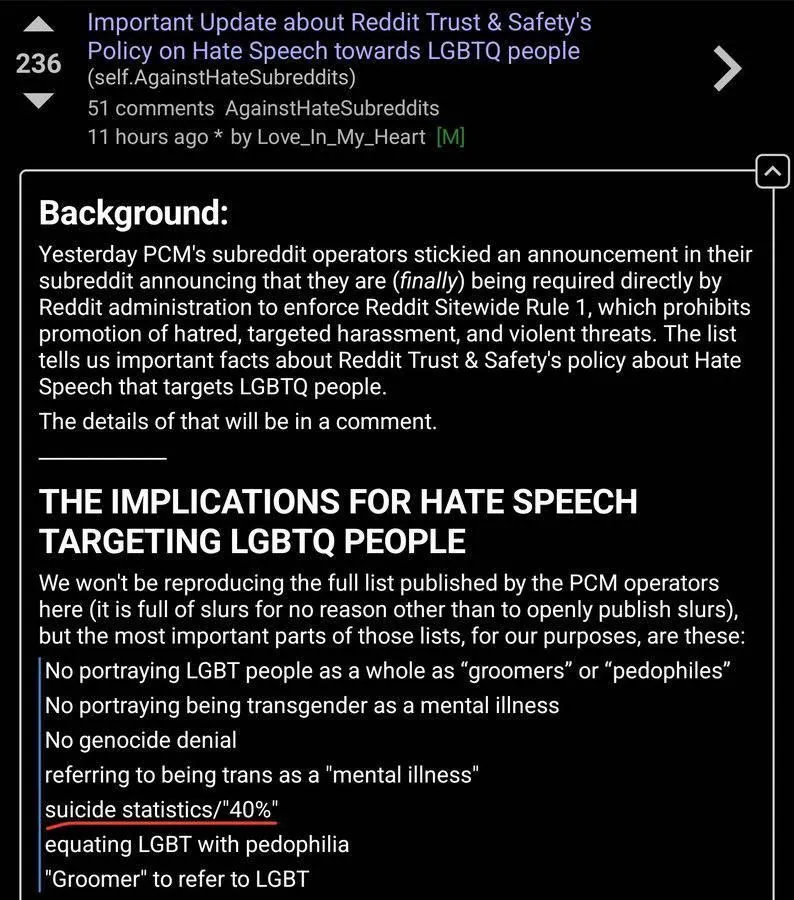 They could not have made it any clearer. It is Reddit's policy, explicitly, to protect depraved sexual deviants, including dangerous predators that go after children; to suppress important truths, while allowing the promotion of dangerous and harmful lies.