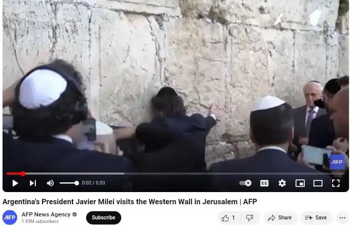 Javier Milei, touches the Western Wall, the holiest site where Jews can pray, at Jerusalem's Old City, Tuesday Feb 6, 2024. (AP/Leo Correa). In a show of solidarity with Israel, Argentina's new president, is in Israel, after choosing it as the site of his first presidential bilateral trip