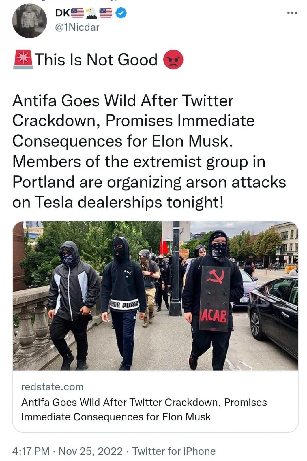 Yeah on the three years ago but look @ the sheer number of these combat ready assault troops, why there must be @ least a dozen or maybe thirteen of them! Why ole Elon must be shaking in his $3000.00 alligator skin shoes!The pic is from a protest over three years ago.