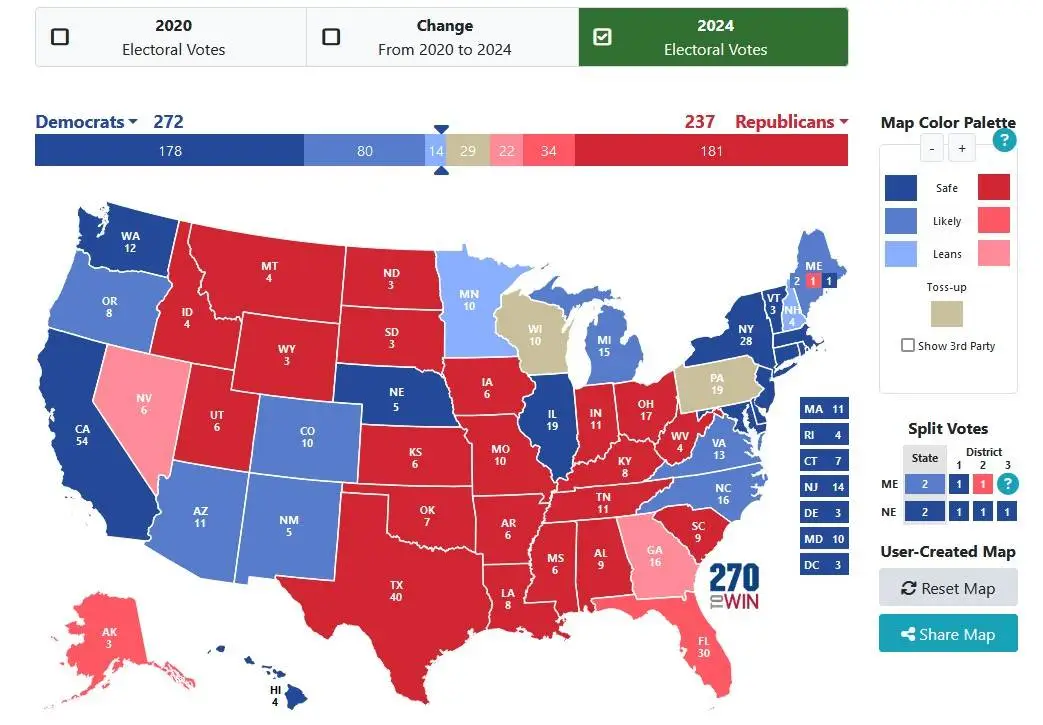Battleground states play a key role in the presidential race, and polls from these states are often considered more telling than national averages, as the popular vote does not guarantee the White House. To become president, a candidate must secure 270 Electoral College votes, and battleground states can swing the election to either candidate.