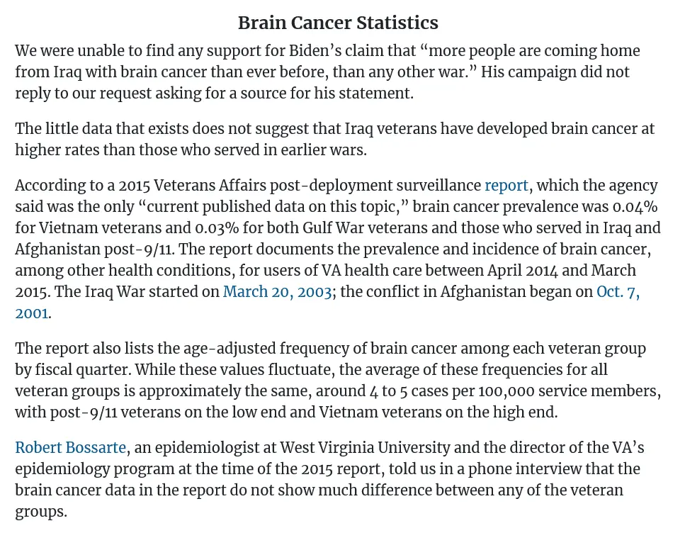 Biden Exaggerates Science on Burn Pits and Brain Cancer