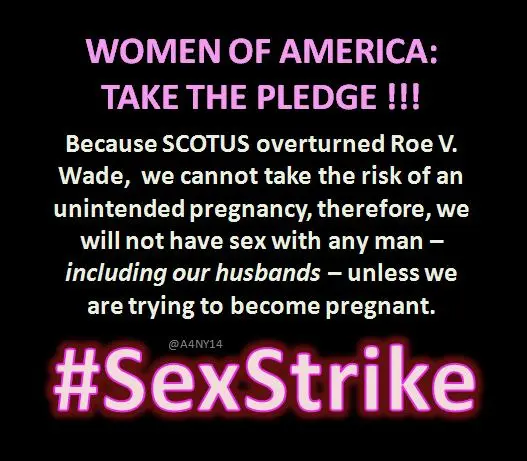 “Because SCOTUS overturned Roe V. Wade, we cannot take the risk of an unintended pregnancy, therefore, we will not have sex with any man–including our husbands–unless we are trying to become pregnant,” a #SexStrike pledge circulating on Twitter says: