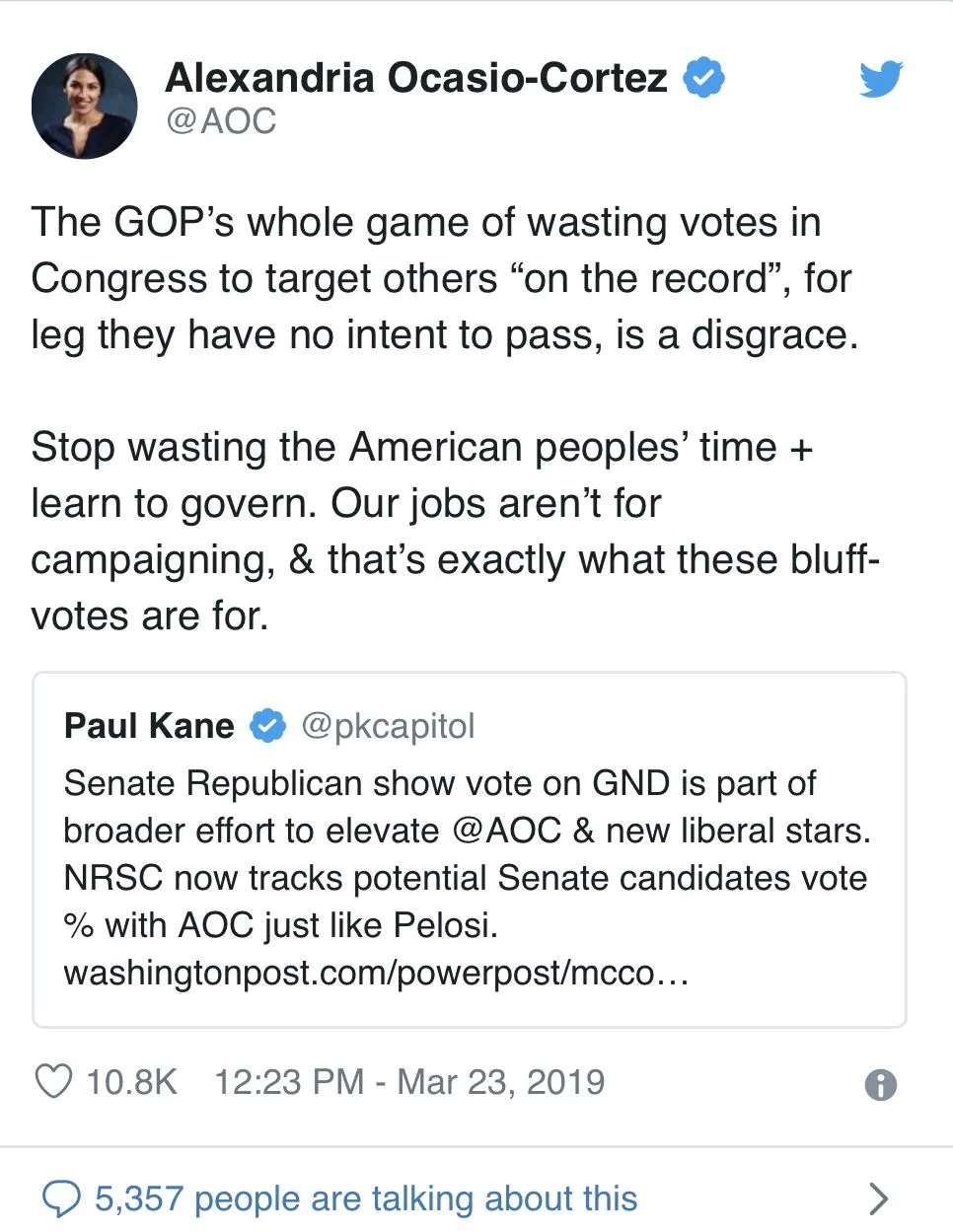 Ocasio-Cortez’s Green New Deal Is So Urgent That She’s Mad GOP Wants To Vote On It