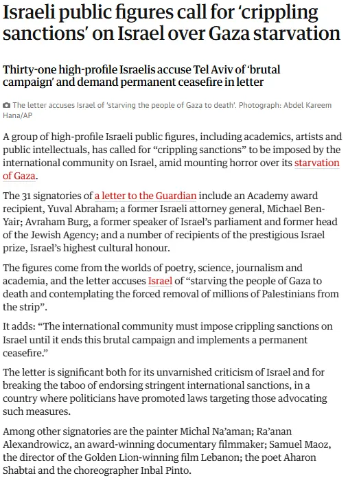 Israeli public figures call for ‘crippling sanctions’ on Israel over Gaza starvation