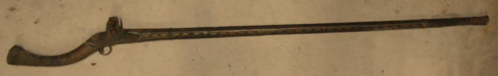 The musket is a 5'-10" late 1700s - early 1800s Jezail Flintlock Musket.... It was popular amongst the Pashtun tribesmen. Jezails were primarily used in the 1st and 2nd Anglo Afghan Wars by Pashtuns and proved very effective against the British.