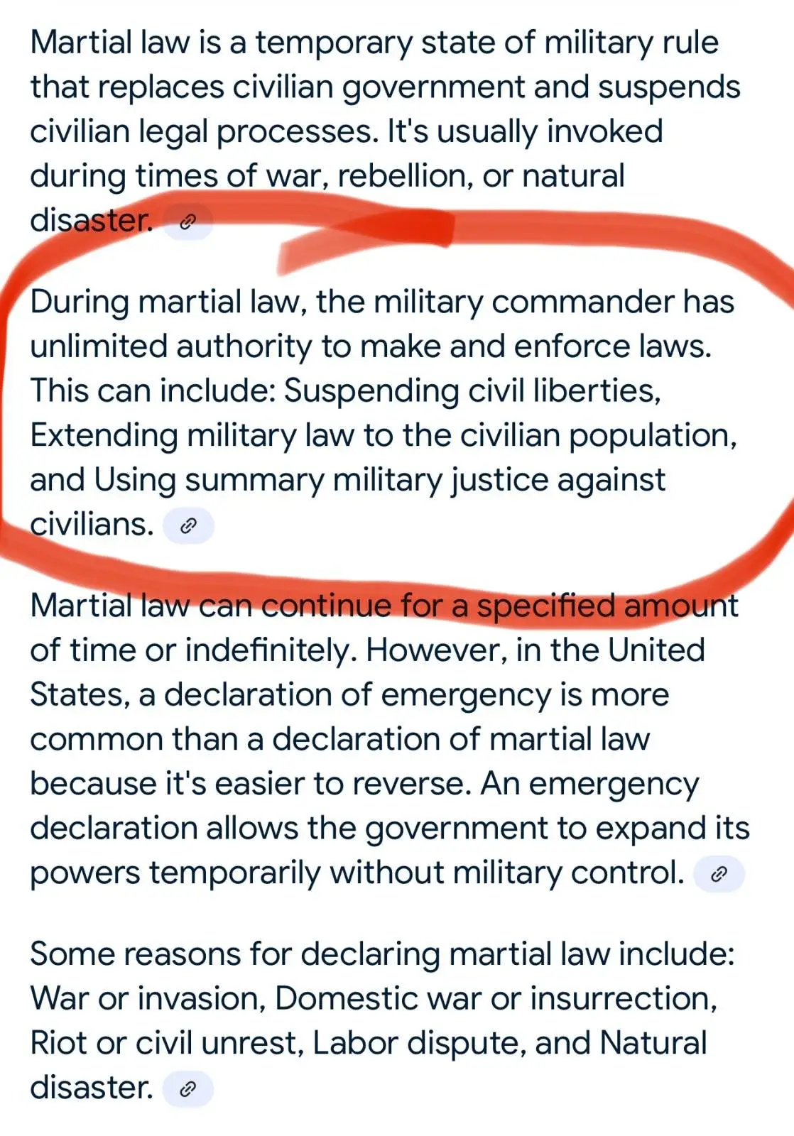 Historically martial law has been declared during foreign invasions and rebellions…We have both with 30-50 million illegals within our Borders. It’s gonna happen…you better hide your abuela Humberto.There is no war, rebellion, or natural disaster. Although God does hate Florida and is lining up to bowl another hurricane at it as we speak.
