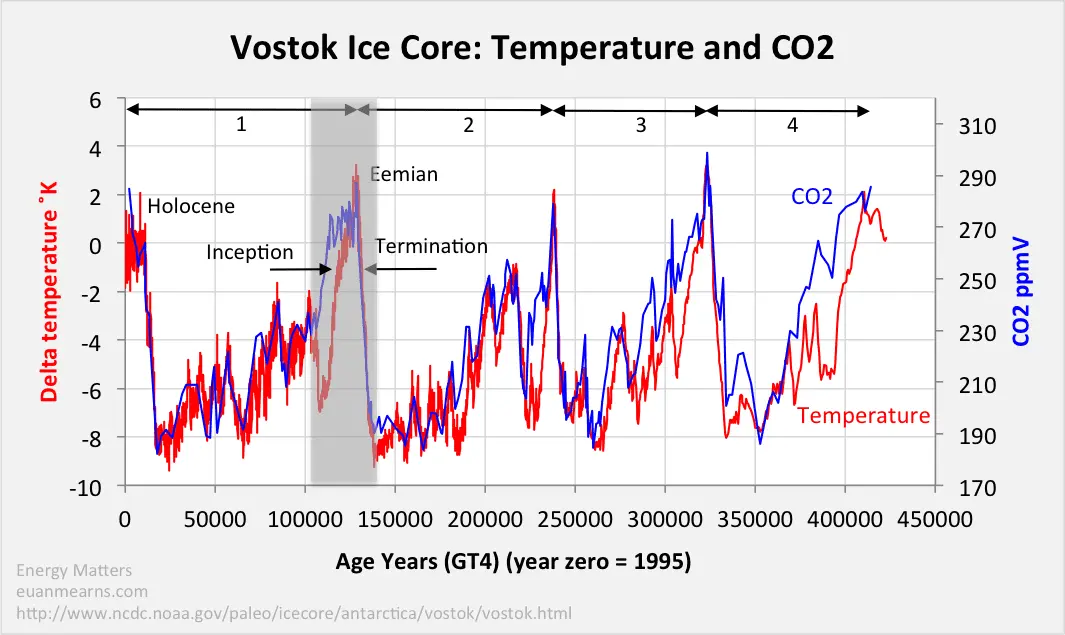 Graphs of CO2 and temperature over different time scales.