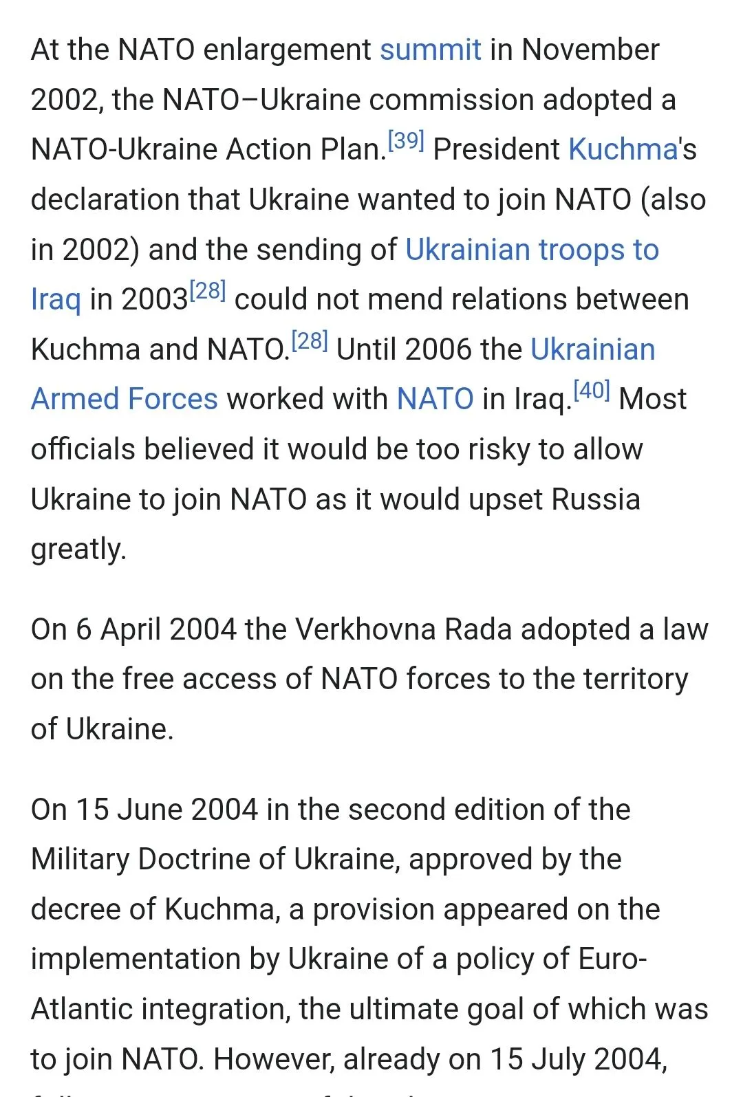 The Ukrainians showed no interest in joining NATO until Russia's invasion of Georgia and they realized they would either have to agree to be governed by Putin or seek to defend themselves against him, however NATO has never had any advanced base in Ukraine and there was no possibility Ukraine would be able to join NATO before the Russian invasion; now, of course, it is impossible too imagine any kind of peace, even if Russia withdraws from Ukraine unless Ukraine becomes a member of NATO.