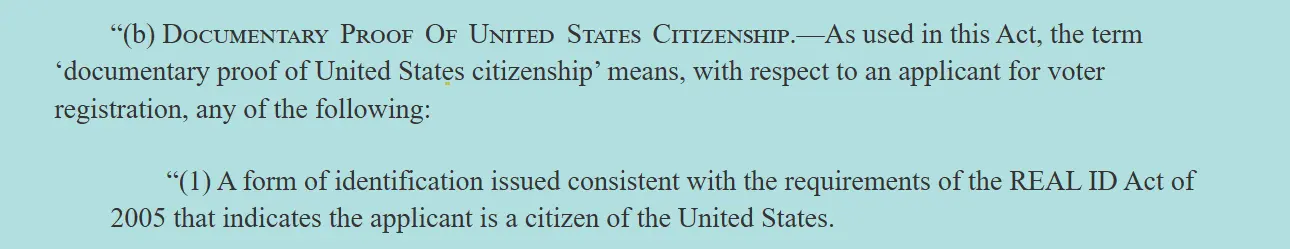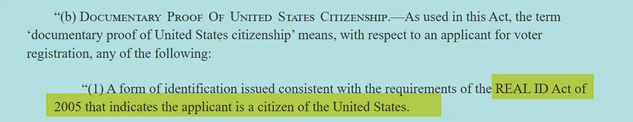 But for voting purposes the SAVE Act say only the ones that show citizenship are valid to register to vote. But since REAL ID Drivers Licenses don't show citizenship they can't be used. Now there are a few northern states that issue what are called "Enhanced IDs" that are REAL ID compliant and do show citizenship to facilitate travel to Canada. But most states don't.