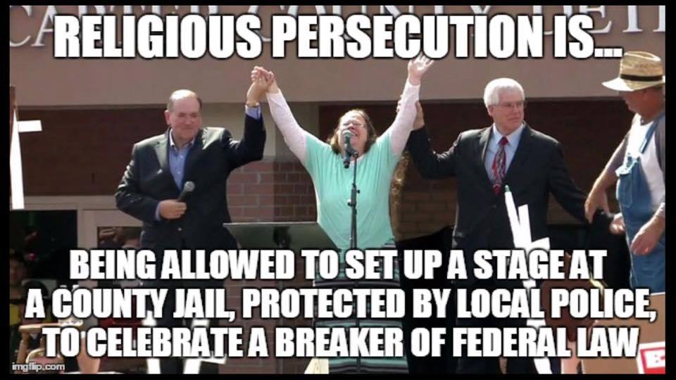 Wrong, Dante. The Constitution protects Kim Davis's rights to her faith and to defend her faith. She was elected to do that job and took an oath to do it as it was at that time - marriage is between a man and a woman. She has upheld that oath. She was released from jail because her rights were violated. I thank God she stood up for her rights as a Christian. She did the right thing.
