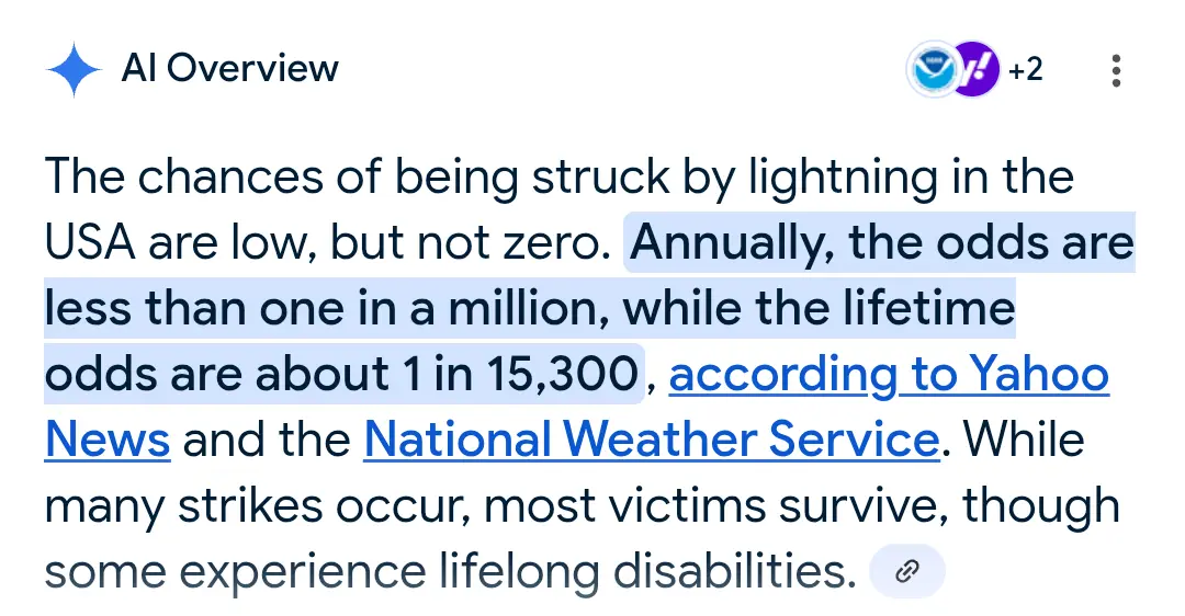 AI summary of lightening strikes in the USA -By that logic I shouldn’t have whole house surge protection to mitigate against the risk of lightning striking my house.