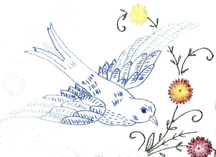 The flowers on the rest of the sunflower/colorwheel/cornered square were very large, much larger than mine, which were larger than ones I'd done previously, since they were the diameter of a nickel plus the width of a fat pencil mark all the way around. The square actually has a bird as the center of attention, and I truly have no idea what bird exactly it is, thrush? bluebird? sparrow? With no instructions, there's no telling! I looked at mountain bluebirds, though, but the eye will have to be made rounder since that's the decision I made. Unless a true ornithologist comes by here in the next hour or two (or before tomorrow) and recognizes it, it's a bluebird in the meantime. I really would like to know, because there are 12 squares like this one, and I wouldn't mind knowing for sure what it is.