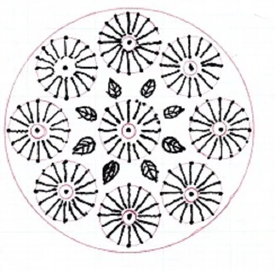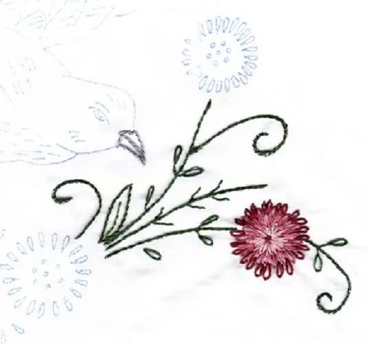 Oh, I saw strawflowers that would have plenty of color layers, so at least the first flower resembles one as it might a chrysanthemum or even a daisy. I have no idea what kind of plant has that little tiny round leaf, but a strawflower leaf is huge and has more separations that a beautiful maple or oak leaf has. That said, well, we're definitely taking some artistic license on this first square. Here's the day's work. I had to do constant supervision to get my husband to vacuum the staircase to remind him to NOT overfeed the dog, who threw up at least 3 meals on it before I went downstairs on that particular staircase, so he needed a certain experience to remind him to NOT feed the dog table scraps.
